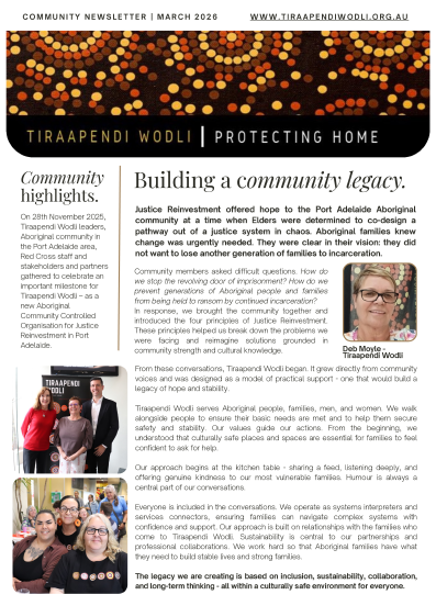 In April 2025, the Tiraapendi Wodli Leadership Group received formal registration of incorporation as an independent Aboriginal Community Controlled Organisation - Tiraapendi Wodli Ltd. Over the coming 6 months, Tiraapendi Wodli and Red Cross will be working through a process to establish independent business and operational systems commencing 1st July 2026.